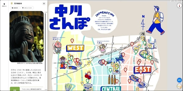 現地でGPSをオンにすれば、現在位置と周辺のスポット情報を一度に確認することが可能。また、お出かけ前の気になるスポットの予習にも活用できる。『中川さんぽ』と連動する「Stroly」を活用して、リアルタイムな街歩きを楽しもう。