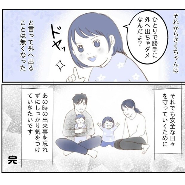 普段から子どもの安全対策に気を付けていたこやま家さん夫妻でさえ起きてしまった今回の騒動。子どもは大人が想定している以上の行動力をすることがありますよね。子どもの年齢によって行動はさまざまです。常にアンテナを張って、わが子の月齢に合わせた安全対策をしていきたいですね。また、お話がわかるようになってきた子には、普段から一人で外に出てはいけないこと、どんな危険があるのか、といったことを伝えていくのも大切です。