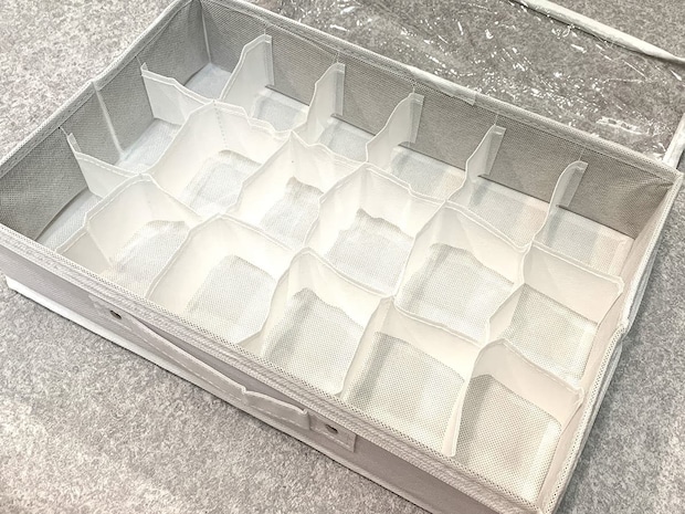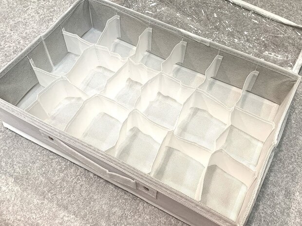靴下やハンカチといった、こまごまとした衣類の収納に便利なのが「透明フタ付18小分けBOX」です。