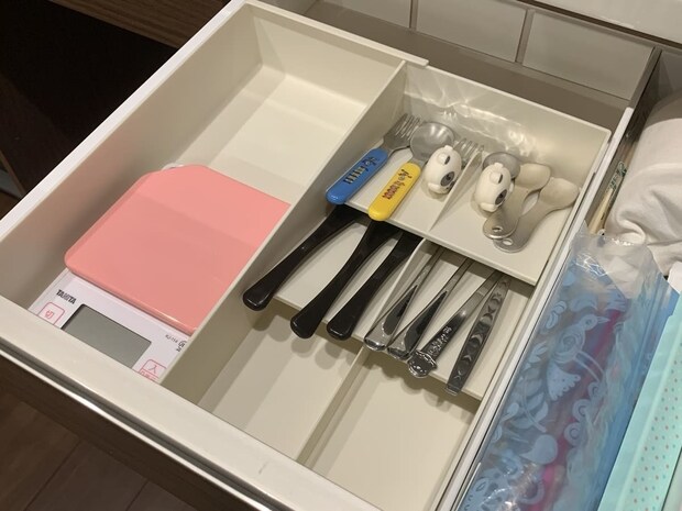引き出しの幅に合わせてケース自体を伸縮させられるので、余ったスペースに他の調理器具を置くこともでき、見た目がすっきりと整います。