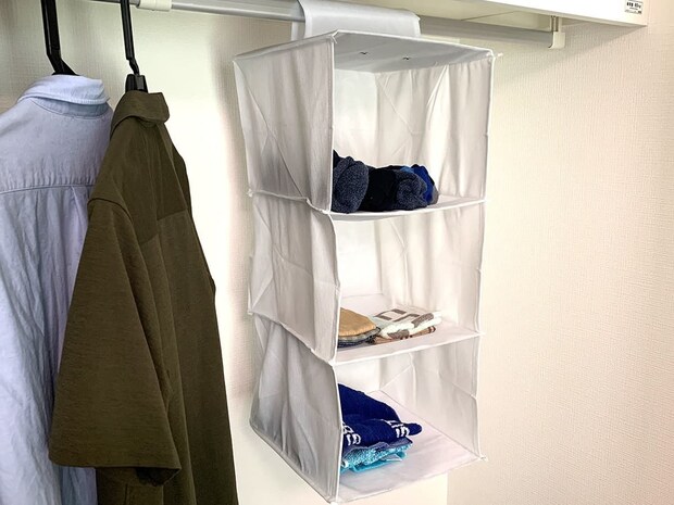 この商品はクローゼットのポールに掛けて使用する三段構造の収納ボックスで、衣類などを種類ごとに仕分けて整理するのに役立ちます。