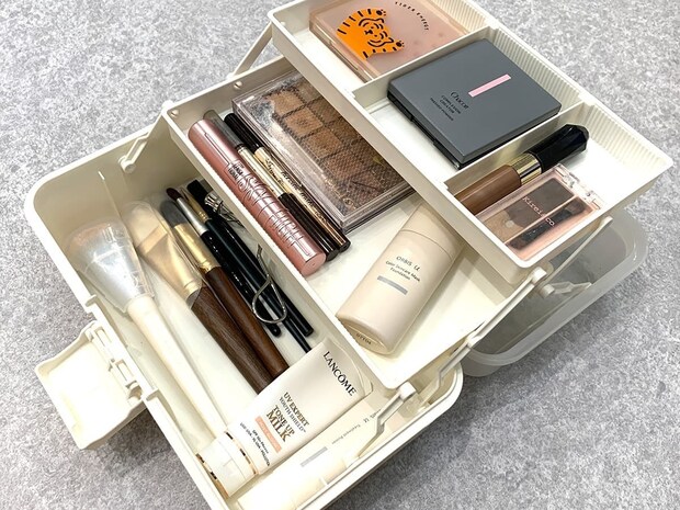 蓋を開けると同時に三段式のトレーが広がり、収納したアイテムのすべてを一目で把握できます。文房具から化粧品、工具まで、あらゆる小物の整理に役立ちます。
