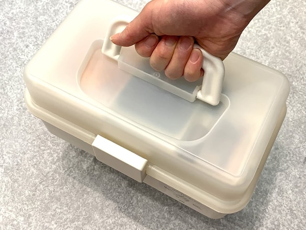 上部の持ち手で片手で楽に持ち運べ、しっかり閉まる蓋が中身の散乱を防ぐので、場所を移動しての作業にも便利です。