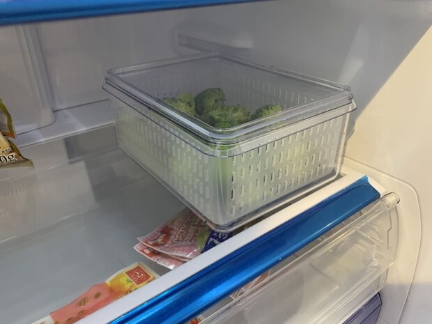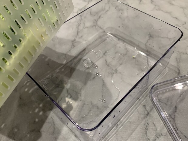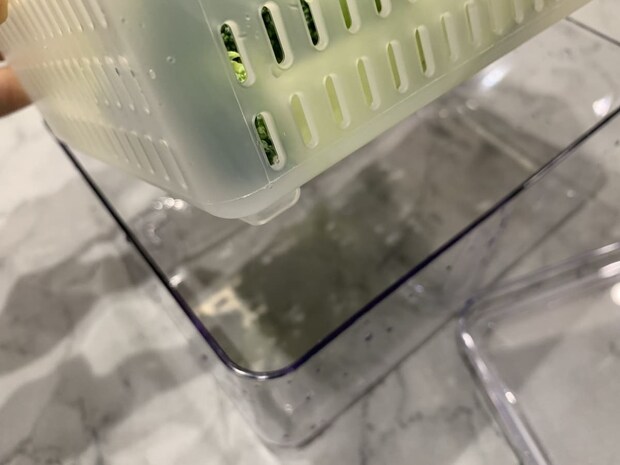 ザルには脚が付いているため、容器の底に水が溜まっても食材が直接触れることはありません。この工夫により、食材が水浸しになるのを防ぎ、シャキッとした鮮度を長く保つことができます。