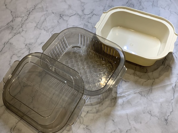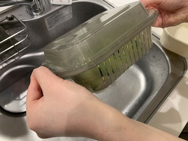 さらに、この商品の優れた点は、調理後の水切りも同じ容器で完結できることです。加熱によって野菜から出た水分を、別のザルを用意することなく、容器を外すだけで簡単に切ることができます。