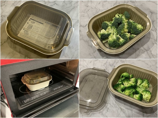 使い方は、洗った野菜をザルに乗せ、付属の目安表を参考に指定時間加熱するだけ。実際にブロッコリーを調理したところ、色鮮やかにしっかりと火が通りました。