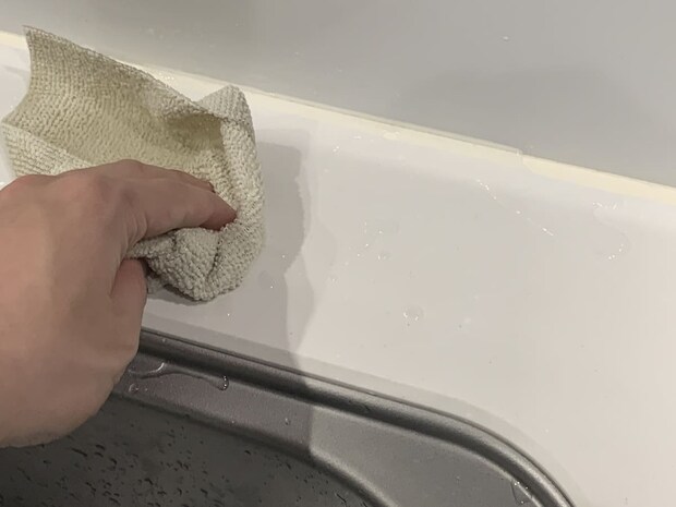 実際に拭いてみると、素早く水分を除去できました。キッチンに一枚置いておくだけで、いつでも手軽に掃除ができ、非常に役立ちます。