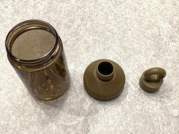 蓋は中身の残量が一目でわかる透明なスクリュータイプで、簡単に外れる心配がなく、中身がこぼれにくい安心設計です。また、飲み口部分には専用の小さな蓋が付いています。