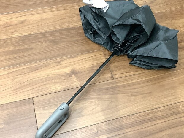 この傘の注目すべき機能は、まず商品名にもある「自動開閉機能」。持ち手のボタン一つで、中棒が伸びて傘が開き、もう一度押せば傘が閉じるため、折り畳み傘にありがちな煩わしい操作を簡略化できます(※中棒の収納は手動)。