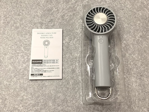 コードレスでどこでも使える「ペルチェ付き2重構造ハンディファン」。落ち着いたカラー(アイボリー・グレー)で、誰でも使いやすいデザインです。
