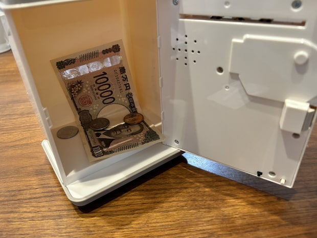 紙幣は自動で巻き取ってくれる機能がついており、「ジジジー」と効果音を出しながら巻き取ってくれます。硬貨は投入しても、効果音はありません。
