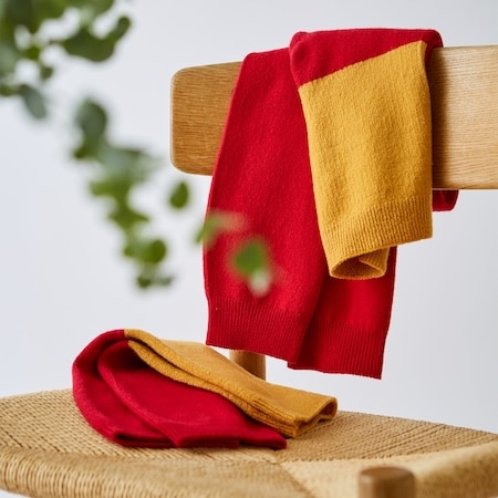シルクは、実はウールと同等に保温性の高い素材。ふっくらと編んだシルクウールは、さらに空気を含んでとても暖かく、外側のウールが外気を遮断してシルクから放出された湿気を熱に変えて保温する。