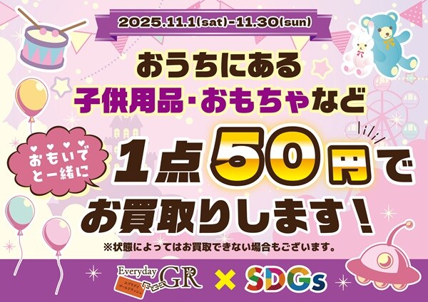 同企画では、「エブリデイゴールドラッシュ」が、子供用品やおもちゃを1個50円で買い取る。買い取ったおもちゃは、SDGsの一貫として、12月のクリスマスシーズンに保育園・養護施設へ寄付していく。