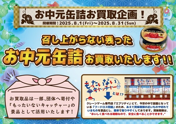 「お中元缶詰100円で買い取りします」では、賞味・消費期限切れの缶詰の買い取りを実施。
