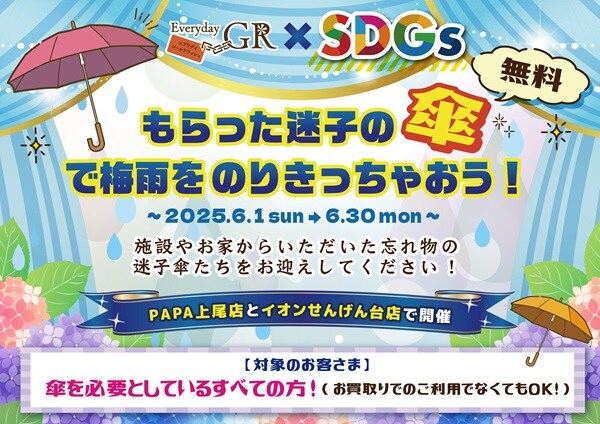 「ビニール傘無料配布企画」では、PAPA上尾店の事務所に保管されていた忘れ物のビニール傘を回収し、PAPA上尾店とイオンせんげん台店の2店舗で無料配布。