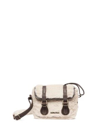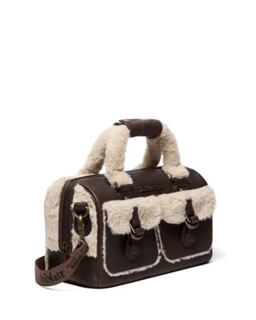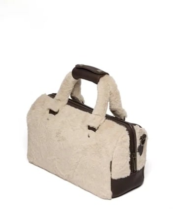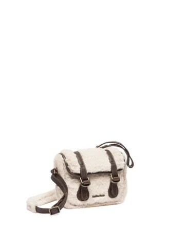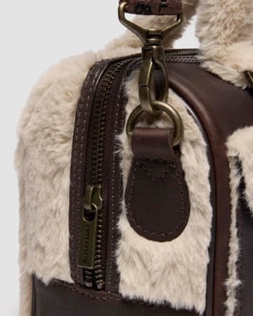 「7″ Satchel Dark Brown+Natural Grizzly+Milo Fur」22,000円(税込)は、スマートフォンや小物が収まるちょうど良いサイズ仕様。グリズリーレザーのパイピング仕立てで、ストラップベルトにはアンティーク調のバックルが付いている。ナチュラルミロフェイクファーが柔らかで温かいふんわりしたフォルムを楽しませてくれる。