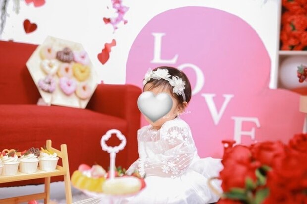 膝から降ろすと泣いてしまう娘さんのために、乗せたまま撮影したおがさん。写真には娘さんしか映っていないように見えますが、「縁の下の力持ち」で母が撮影を支えていました。撮影小物のバラなどでうまく隠されていて、カメラマンもこうした状況に慣れていたのかもしれませんね。