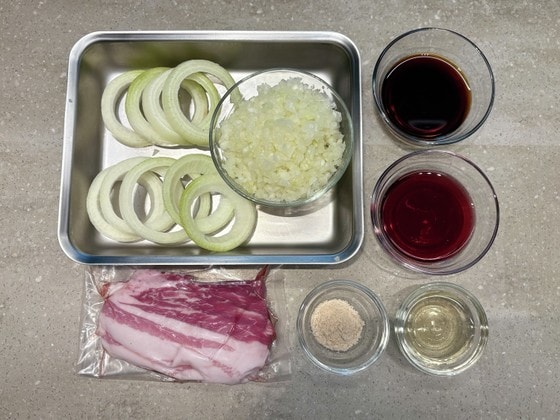 材料は玉ねぎと豚バラ、調味料だけ!玉ねぎは1cm位の輪切りにして、2重のリング状にします。残った内側の部分はみじん切りにしてソースに使います。