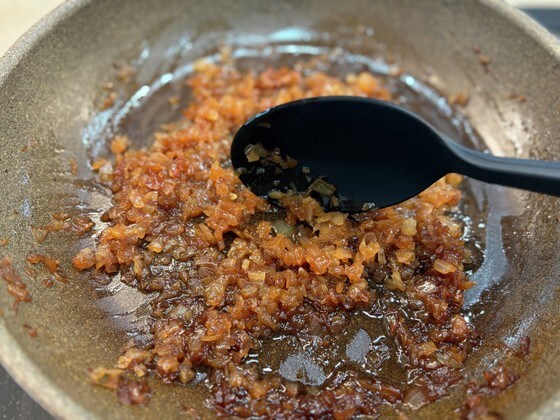 フライパンに並べて焼いていきます。みじん切りにした玉ねぎと調味料は全て合わせておきます。両面に焼き色がついたら、オニオンソースを入れて沸騰したらフタをして、様子を見てひっくり返します。