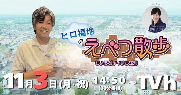 今年4月より江別市まちづくりアドバイザーを務めるタレント・ヒロ福地さんが、地元・北海道江別の魅力をたっぷり紹介するテレビ番組『ヒロ福地のえべつ散歩~ちょうどイイまち江別~』が放送される。