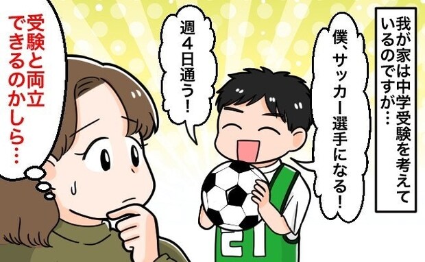 サッカーが大好きな小学1年生を育てるママの悩みです。中学受験を考えると、いつかはサッカーよりも勉強を優先せざるを得ない時期がくるかもしれません。一方、親として夢を持って頑張る子どもを応援したい気持ちもにじんでいます。