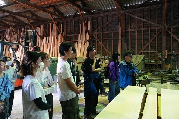 また、協力企業の塩崎商店では製材の工程を体験し、木材の特性や森とのつながりを実感。現場で得た知見を作品制作に生かすため、木材の端材を使った創作にも挑む。