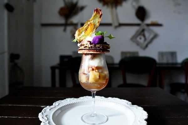 千葉の新検見川にあるパフェ専門店「cafetento」は、地元のさつまいも、味噌、醤油を組み合わせ、地産地消の想いを込めた「芋と蔵のパフェ」を期間限定で提供する。