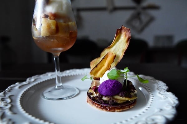 グラスの中では、芋のねっとりとした甘みと香ばしさを軸に、味噌のクランブル、洋梨のジェラート、バニラとスパイスのジュレ、アールグレイのジュレなどが重ねられている。「発酵の旨み」「果実のやさしい酸味」「スパイスの余韻」「紅茶の澄んだ香り」がひとつに溶け合う設計だ。