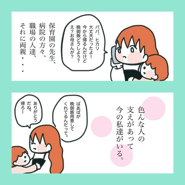 ヒカリちゃんが救急搬送されたと聞き、とても驚いたことでしょう。ですが、今回のできごとを通して、会社の同僚や保育士さん、そして家事のサポートをしてくれる実母と、たくさんの人に支えられていることに気づきました。