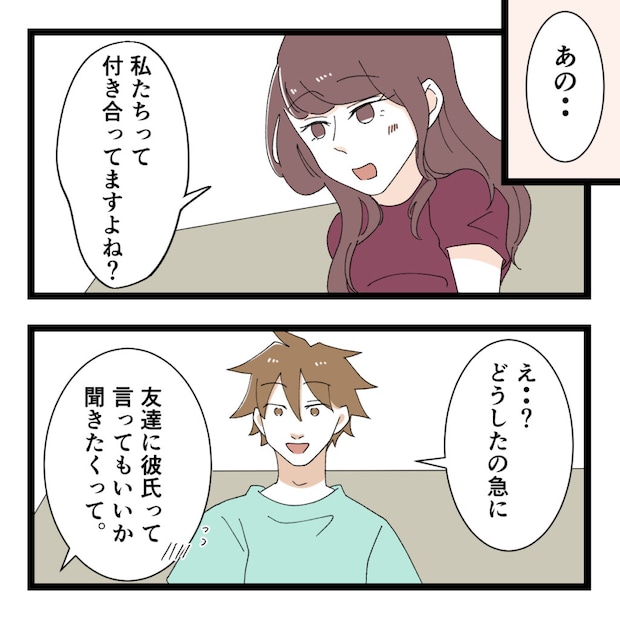 何度かデートを重ねたある日、アユミさんは「あの・・私たちって付き合ってますよね?」とヒロトさんに聞きました。「え・・?どうしたの急に」と返すヒロトさんに「友達に彼氏って言ってもいいか聞きたくって」と遠慮がちに言ったアユミさん。何度も2人でデートをして付き合っているつもりだったアユミさんですが、ヒロトさんの口からはっきりと言葉で言って欲しくて聞いたのでした。