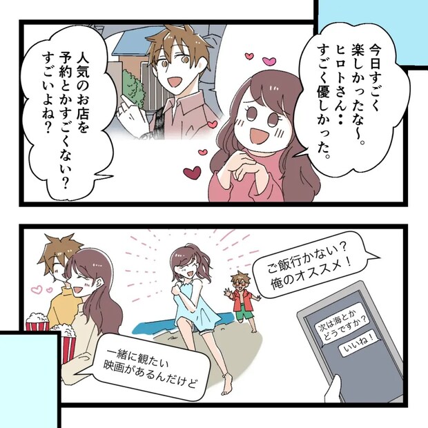 2人でドライブをしたアユミさんは「今日すごく楽しかったな~。ヒロトさん・・すごく優しかった。人気のお店を予約とかすごくない?すごいよね?」とさらに気持ちが膨らみ、その後も食事に行ったり、海に行ったり、映画に行ったりとデートを重ねていきました。