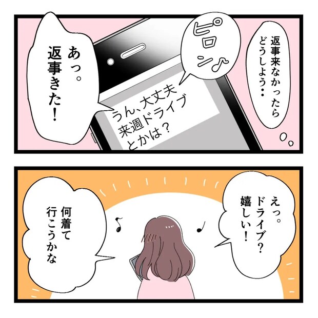 返事が来なかったらどうしよう・・と思っていると『うん、大丈夫。来週ドライブとかは?』と返信が来て「えっ。ドライブ?嬉しい!何着て行こうかな」とアユミさんは大喜び。