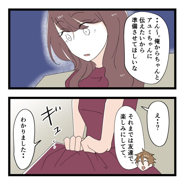しかし、ヒロトさんの口から出たのは思っていたのとは違う答えでした。「・・ん~。俺からちゃんとアユミちゃんに伝えたいから準備させてほしいな」と曖昧に答えたヒロトさんは「それまでは友達で。楽しみにしてて」とにっこり。アユミさんはショックを受けつつも「わかりました・・」としか言えませんでした。
