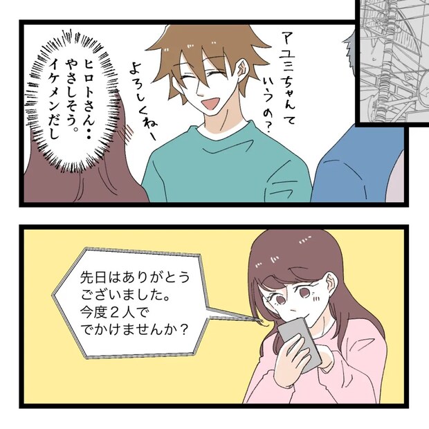 ヒロトさんとアユミさんの出会いは、共通の友達を介してグループで遊んだときでした。アユミさんは「ヒロトさん・・やさしそう。イケメンだし」と優しそうな年上のヒロトさんに一目ぼれ。ヒロトさんに彼女がいるとは知らず『先日はありがとうございました。今度2人ででかけませんか』とメッセージを送りました。