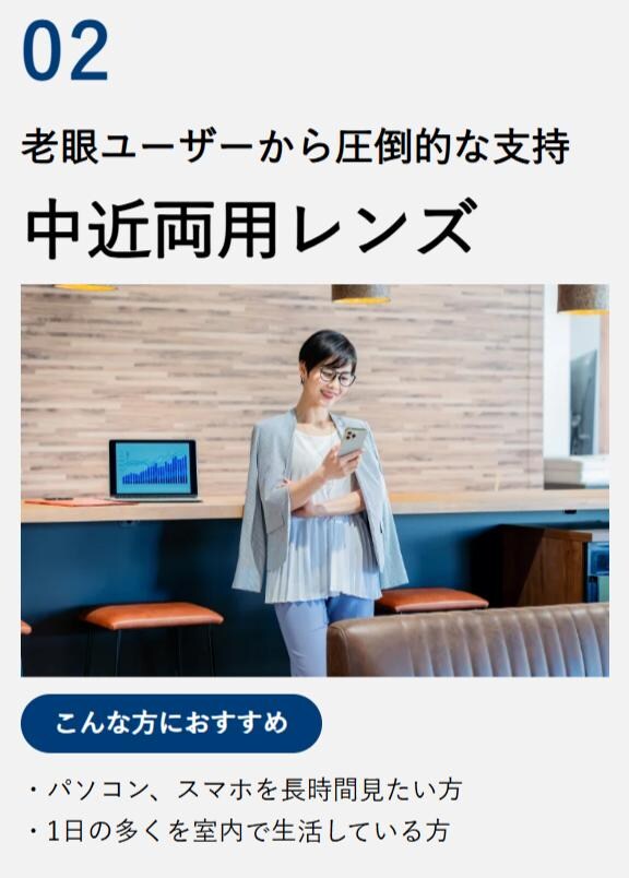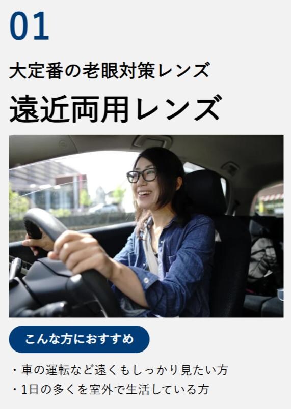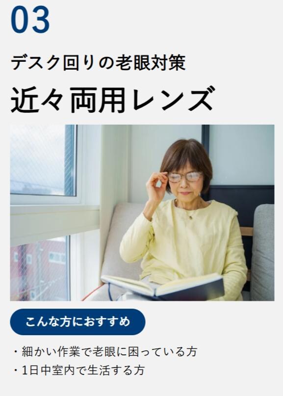 老眼鏡: 遠近両用も追加料金ゼロ!しかも、メガネの愛眼はお客様の世代やライフスタイルに合わせて3種類の遠近両用レンズが¥0で選べます。