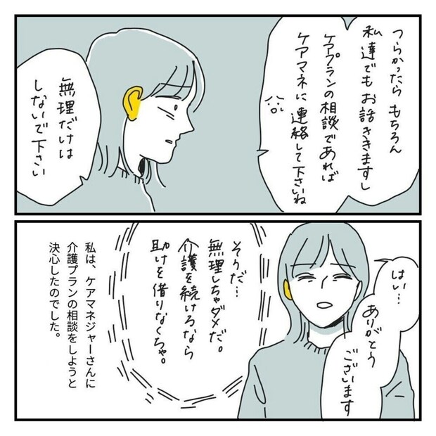 介護を始めてまだ数日ですがキクチさんは心も体もボロボロになってしまいました。ですがヘルパーさんの助言で「無理しちゃダメだ」と気づきます。介護のために家族が一緒に倒れてしまうのは避けたいですよね。