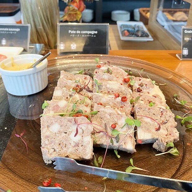この日のランチビュッフェでは、クラシックな「パテ・ド・カンパーニュ」が登場。肉の旨みがぎゅっと詰まり、野菜のシャキシャキ食感がアクセントに。シンプルだからこそ奥深く、素朴ながら力強い味わいがたまりません。シャンパンやワイン(別途追加料金)と合わせれば、さらにおいしさが倍増しそうです。