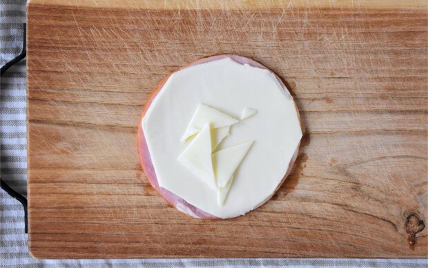 ハムの上にスライスチーズを重ねます。ハムからはみ出したチーズをちぎって、中央にのせます。