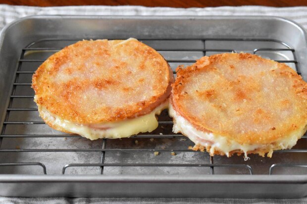 網の上にのせて、あら熱を取ります。中のチーズが固まってきて、ハム同士が接着し食べやすくなります。