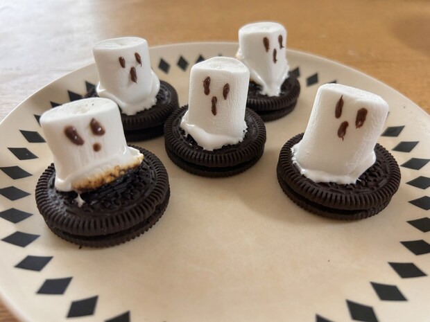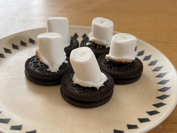 溶けたマシュマロが接着剤代わりになり、ちょっぴりホラーな雰囲気も演出してくれます。焼きマシュマロのおいしさは言わずもがな。オレオと一緒になることでココアの風味もプラスされました。顔の表情にバリエーションを増やしてもおもしろいですね。