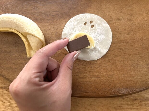 2.ナナメ薄切りにしたバナナを餃子の皮の下半分に置き、その上にチョコレートをのせる