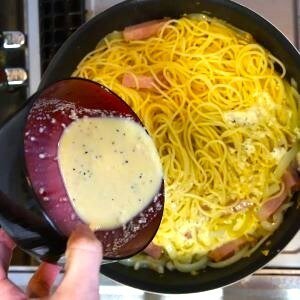 3. ゆで上がったばかりの熱いパスタをフライパンに入れ、あらかじめ合わせておいたソースの材料をフライパンに流し入れる。火はつけず、パスタの余熱だけでソースを仕上げるのがポイント。冷めないうちに手早く混ぜ合わせること。