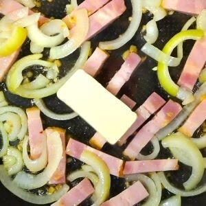 2. フライパンにオリーブ油とにんにくを入れて熱し、香りが出たら玉葱、ベーコンを入れ、しんなりするまで炒める。バターを加え、塩コショウで味を整えて火を止める。