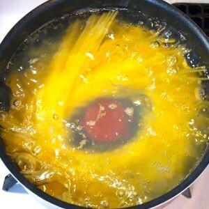 1. 鍋の湯が沸騰したら塩大さじ1、パスタを入れ、中火でゆでる。ゆで時間はパッケージに書かれた時間どおり。