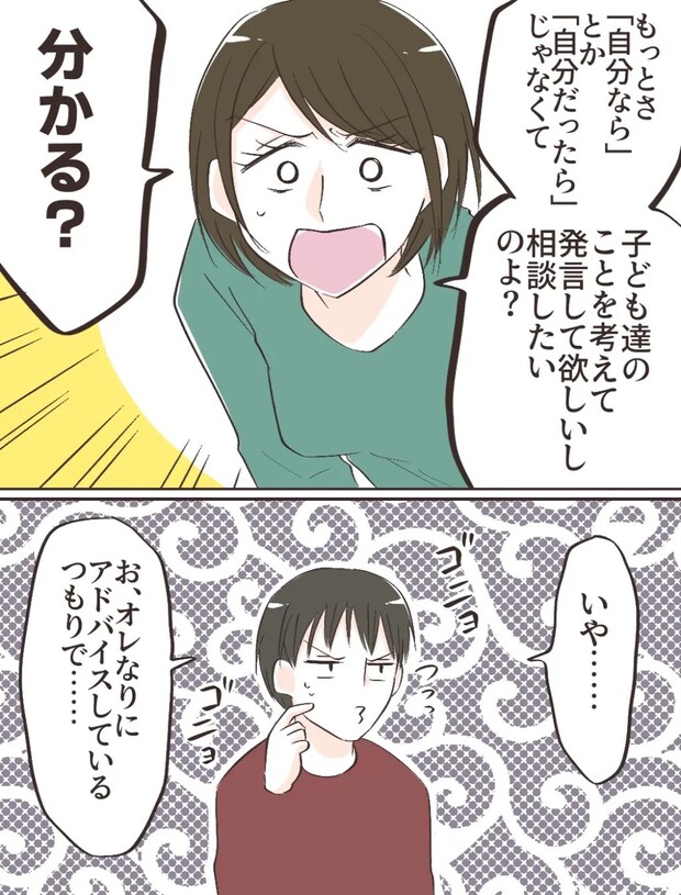 「もっとさ、『自分なら』とか『自分だったら』じゃなくて、子ども達のことを考えて発言して欲しいし相談したいのよ?分かる?」これまでずっと思っていたことを一気にぶつけると、ショウヘイは気まずそうに「いや・・お、オレなりにアドバイスしているつもりで・・」とゴニョゴニョ。