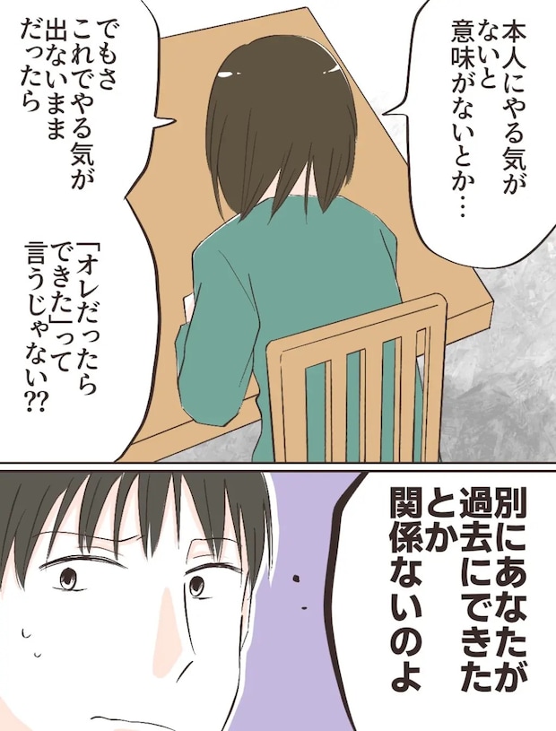 「本人にやる気がないと意味がないとか・・。でもさ、これでやる気が出ないままだったら『オレだったらできた』って言うじゃない??別にあなたが過去にできたとか関係ないのよ」