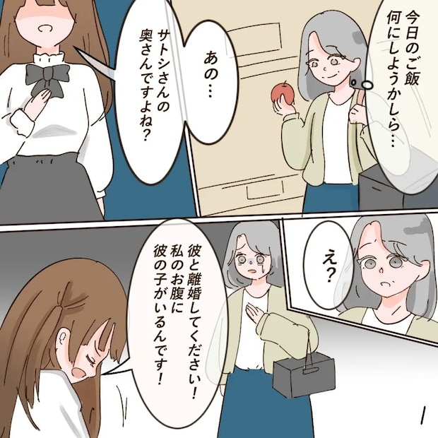 「今日のご飯何にしようかしら・・」と考えながらスーパーで買い物をしていると、「あの・・サトシさんの奥さんですよね?」と若い女性にたずねられ、「え?」と驚くと、「彼と離婚してください!私のお腹に彼の子がいるんです!」と言われました。