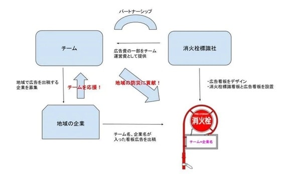 同制度では、地域と深い関わりを持つ企業がスポーツチームを応援する看板広告を設置。広告収入は消火栓標識の維持管理のほか、一部がチーム運営に役立てられる。チーム名やロゴが入った広告はその企業がチームを応援していること、地域防災に貢献していることの証になるため、企業にとって大きな意義があるという。
