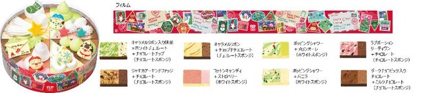 1ピースごとに違った味を楽しめる「パレット」がクリスマス仕様に。ポッピングシャワーやキャラメルリボンなど定番の味わいを詰め合わせた。ケーキ自体が大きなプレゼントに見えるよう、フィルムには赤い包装紙と大きなリボンをデザインした。