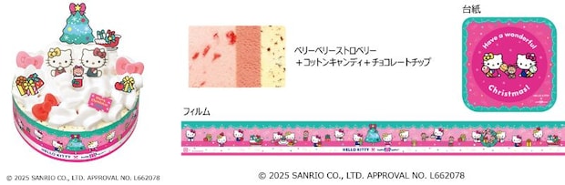 アイスケーキをバラのようなホイップクリームでデコレーションし、大きめサイズの砂糖菓子のハローキティと双子の妹ミミィ、ハローキティのリボンチョコをトッピングした。フレーバーはハローキティのイメージに合うよう「ベリーベリーストロベリー」と赤い「コットンキャンディ」、人気の「チョコレートチップ」の3種を選んだ。